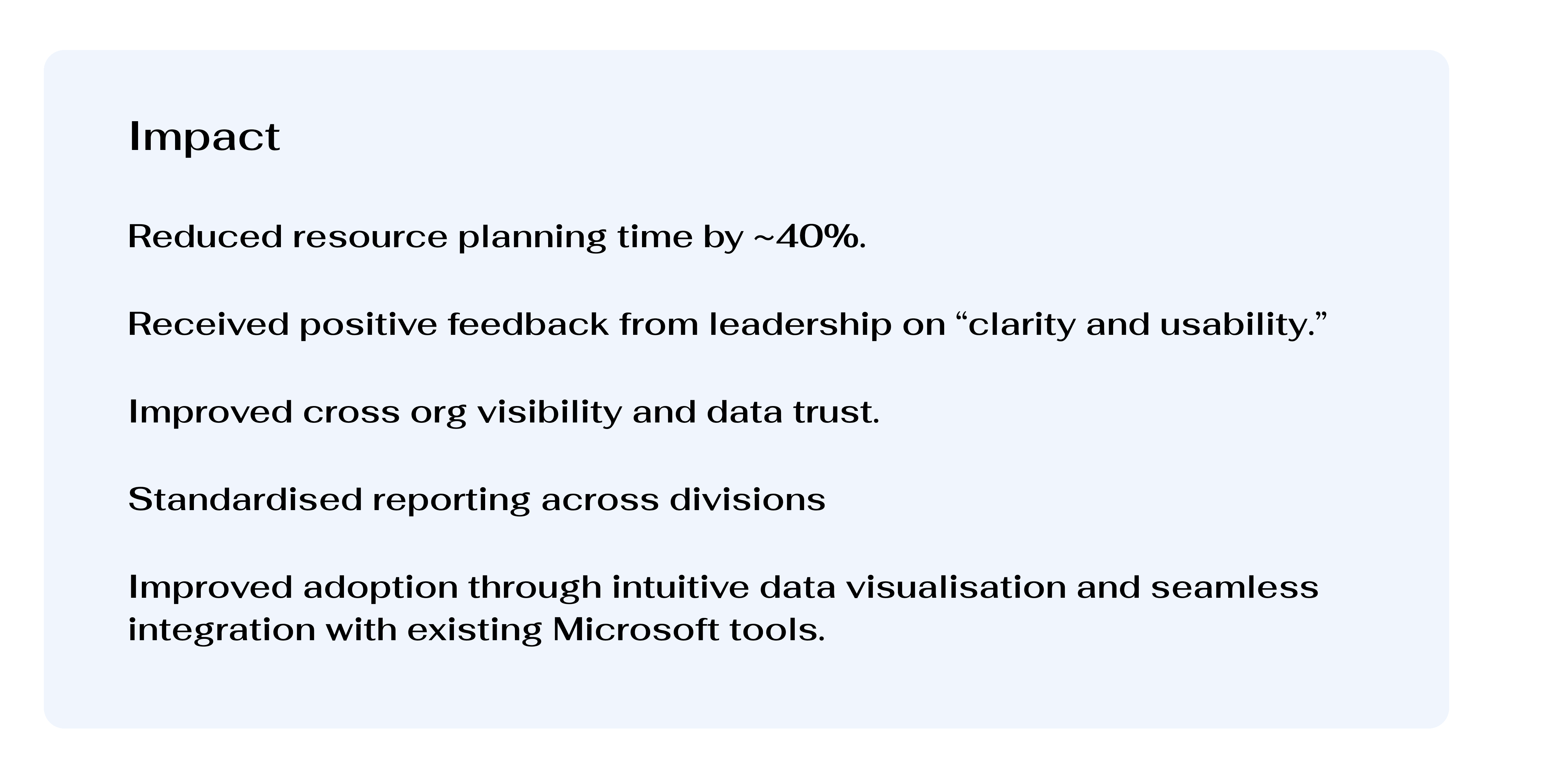 Resource Managers spent significant time manually consolidating data from multiple sources, leading to inefficient planning cycles, limited forecasting capabilities, and reduced confidence in decision-making. This led to manual effort, low data confidence, and delayed decisions, impacting delivery timelines and organisational efficiency.